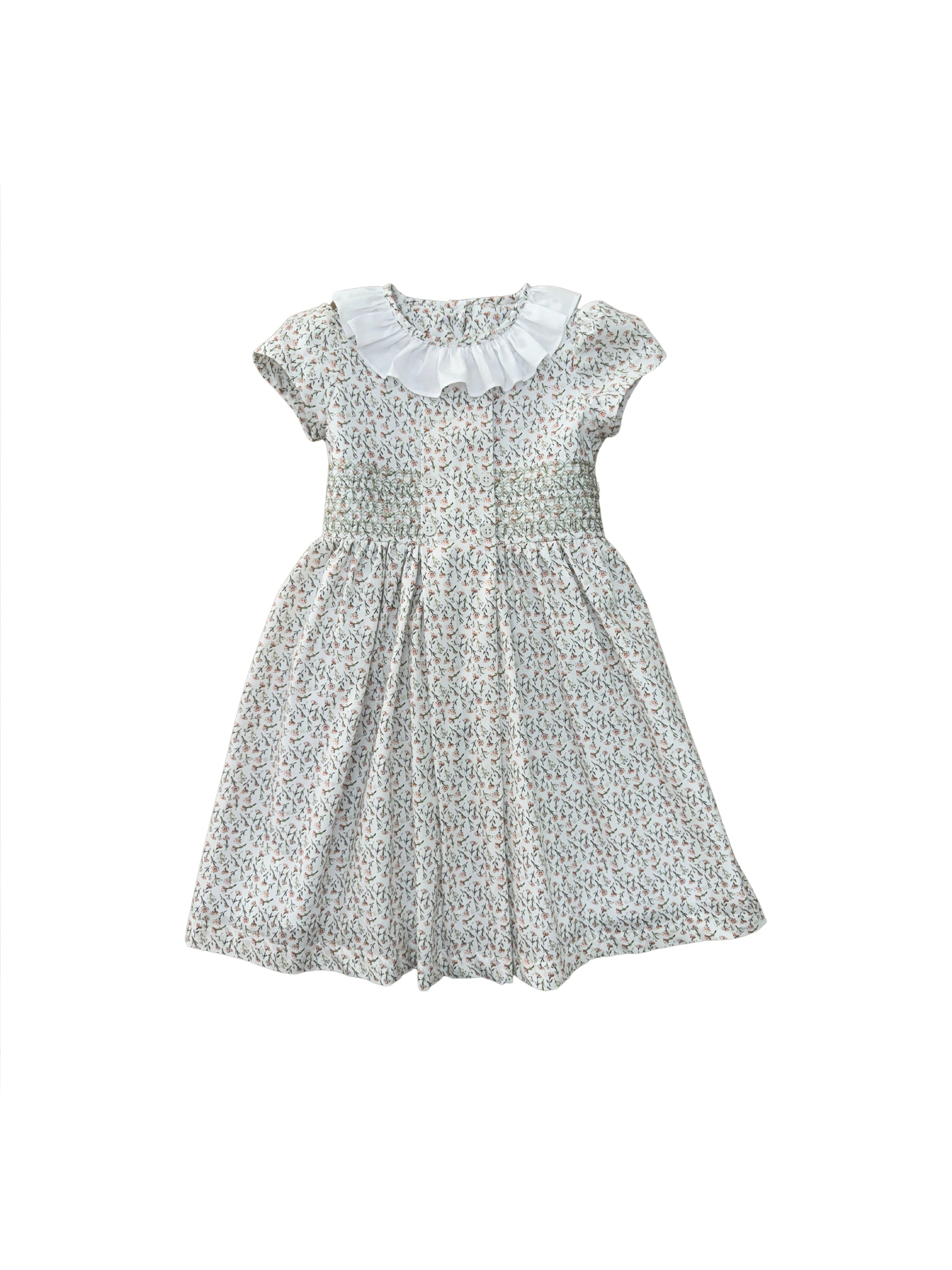 Vestido em tecido estampa liberty em tons de rosa com verde, corpo bordado, tomas no peito com botões, gola babado branco, faixa na cintura estampado.