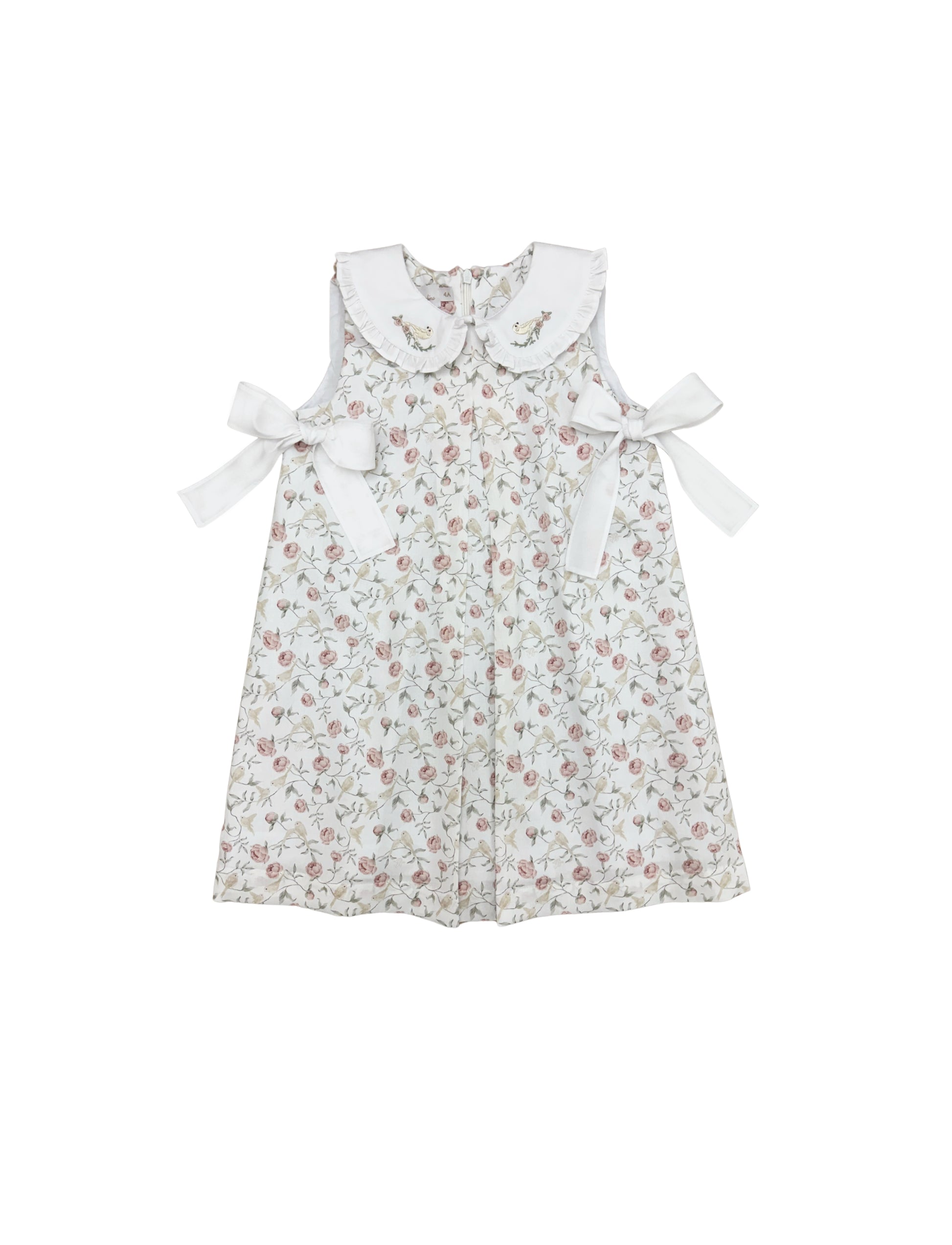 Jumper em tecido estampado de flores com pássaro em tons de rosa com bege, golas brancas bordadas e com frufru, laços laterais brancos.