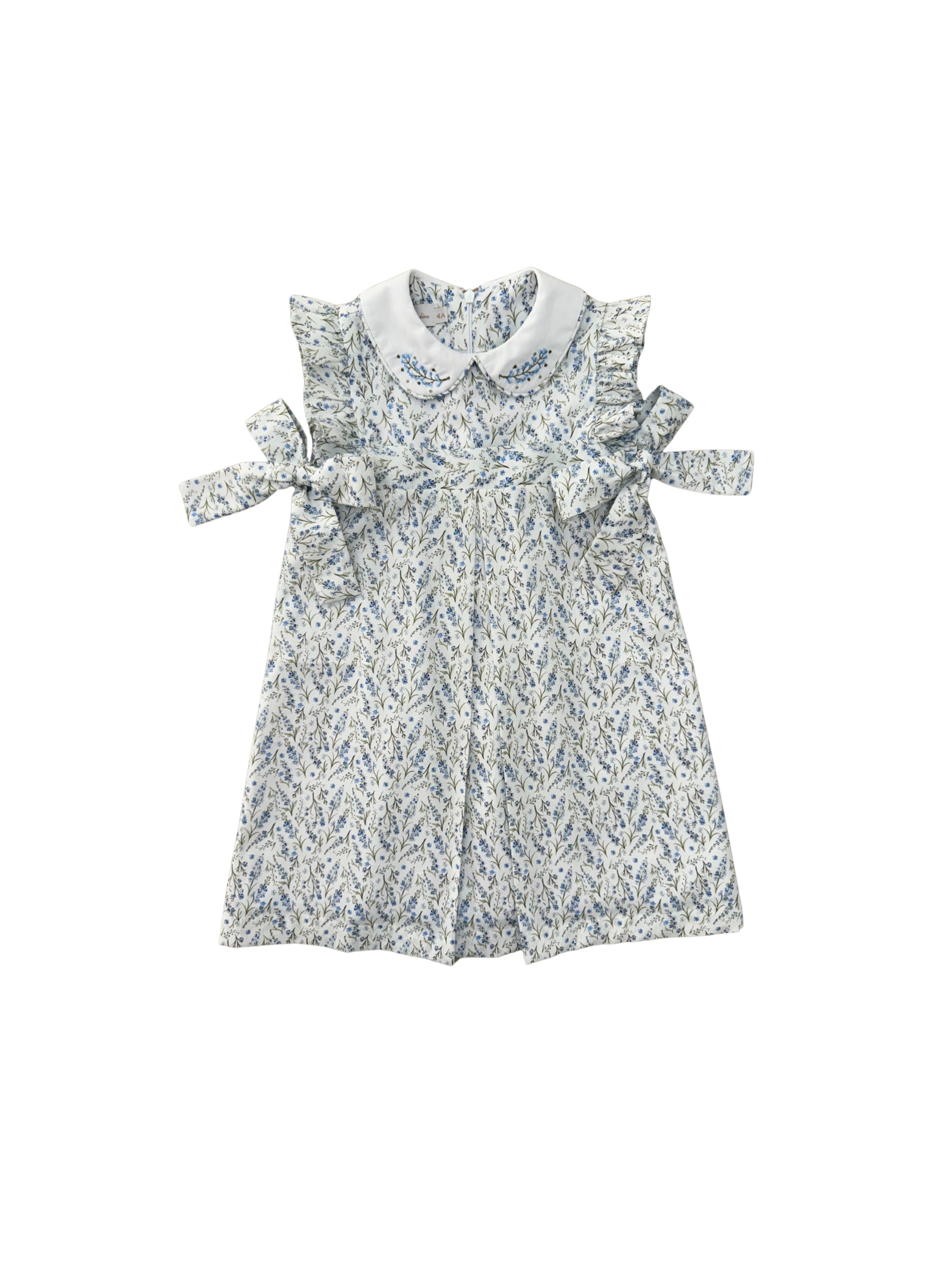 Jumper em tecido floral liberty azul, golas brancas bordadas e com vivo floral, mangas babado floral, laços laterais florais.