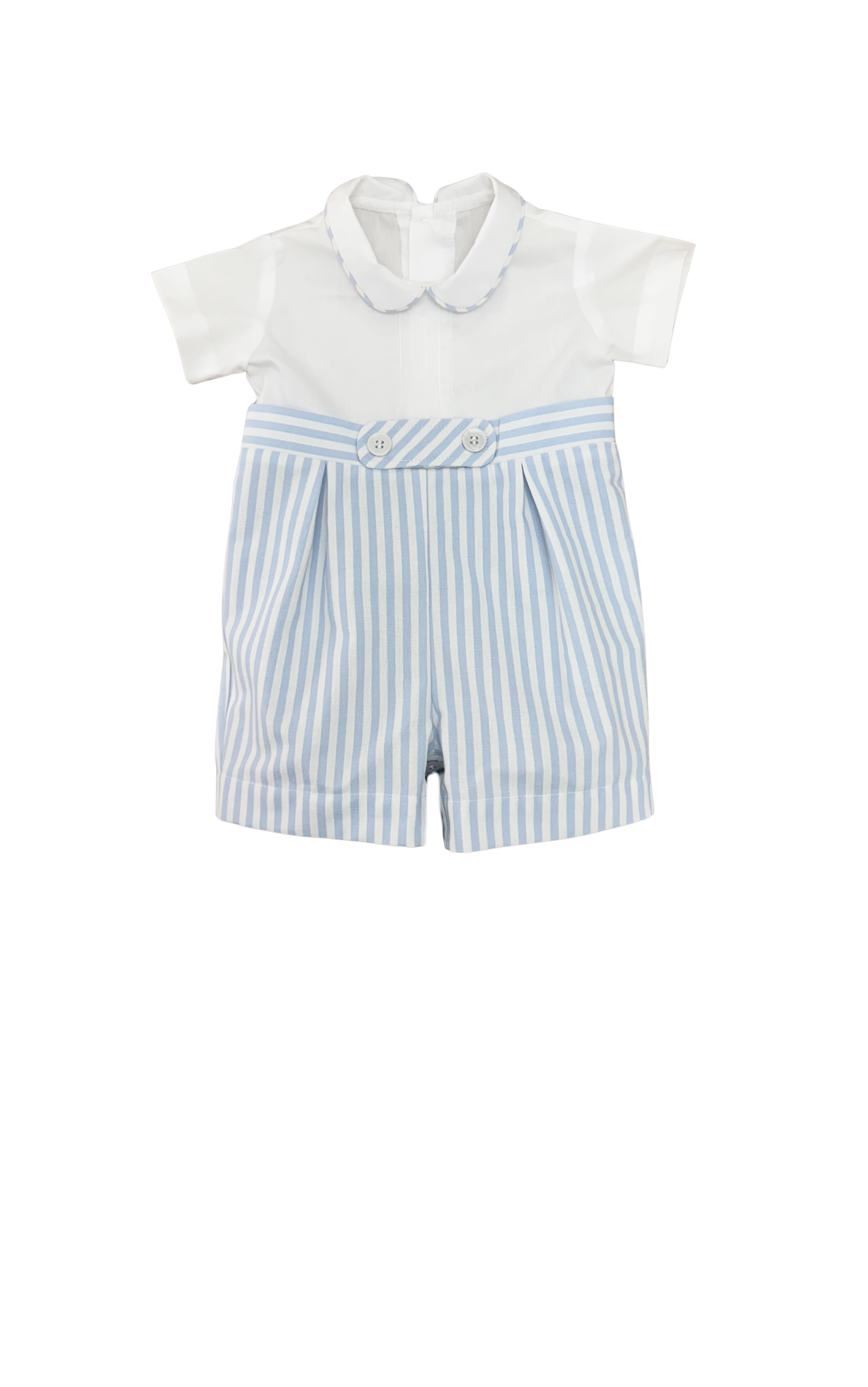 Macacão masculino que imita um conjunto, sendo a parte superior em tricoline branca, corpo com nervuras, golas brancas e com vivo listrado, parte inferior em tecido listrado de azul bb e branco, detalhe na cintura com botões. Abertura nas costas e entrepernas.