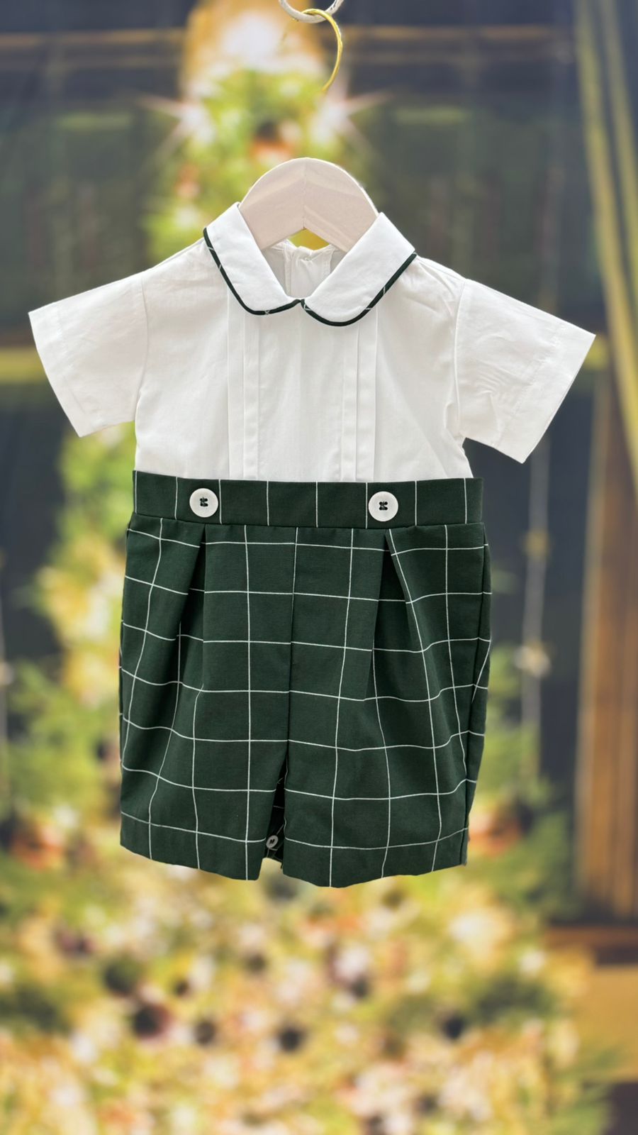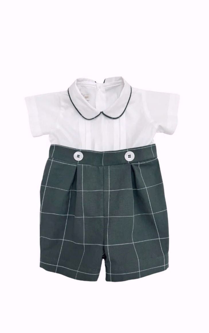 Macacão masculino que imita um conjunto, sendo a parte superior em tricoline branca com pregas, golas brancas e com vivo xadrez, parte inferior em tecido xadrez verde com botões na cintura. Abertura nas costas e entrepernas.