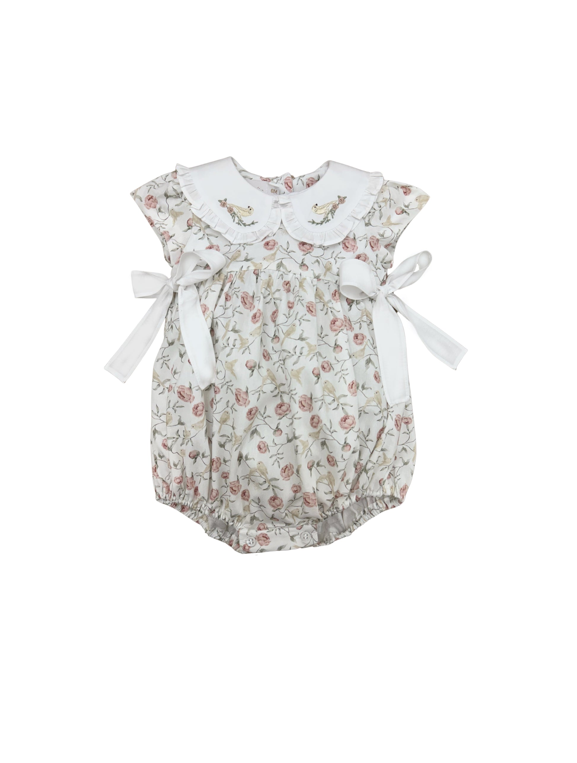 Pimpão feminino em tecido estampado de flores com pássaro em tons de rosa com bege, golas brancas bordadas e com frufru, laços laterais brancos. Abertura nas costas e entrepernas.