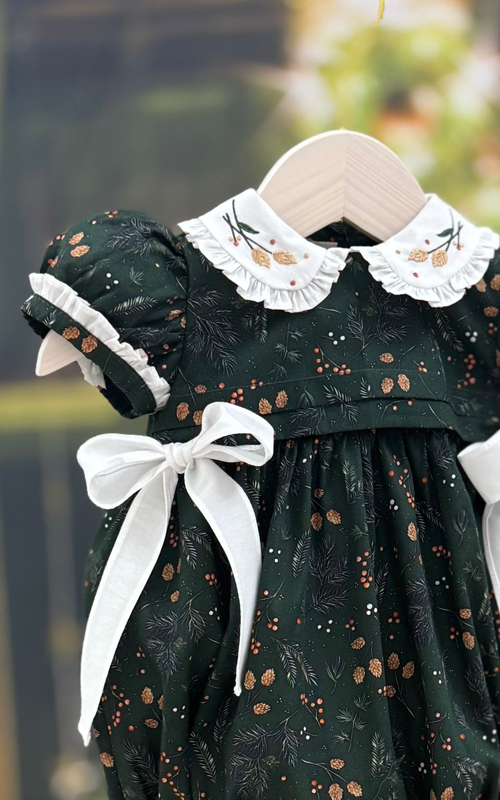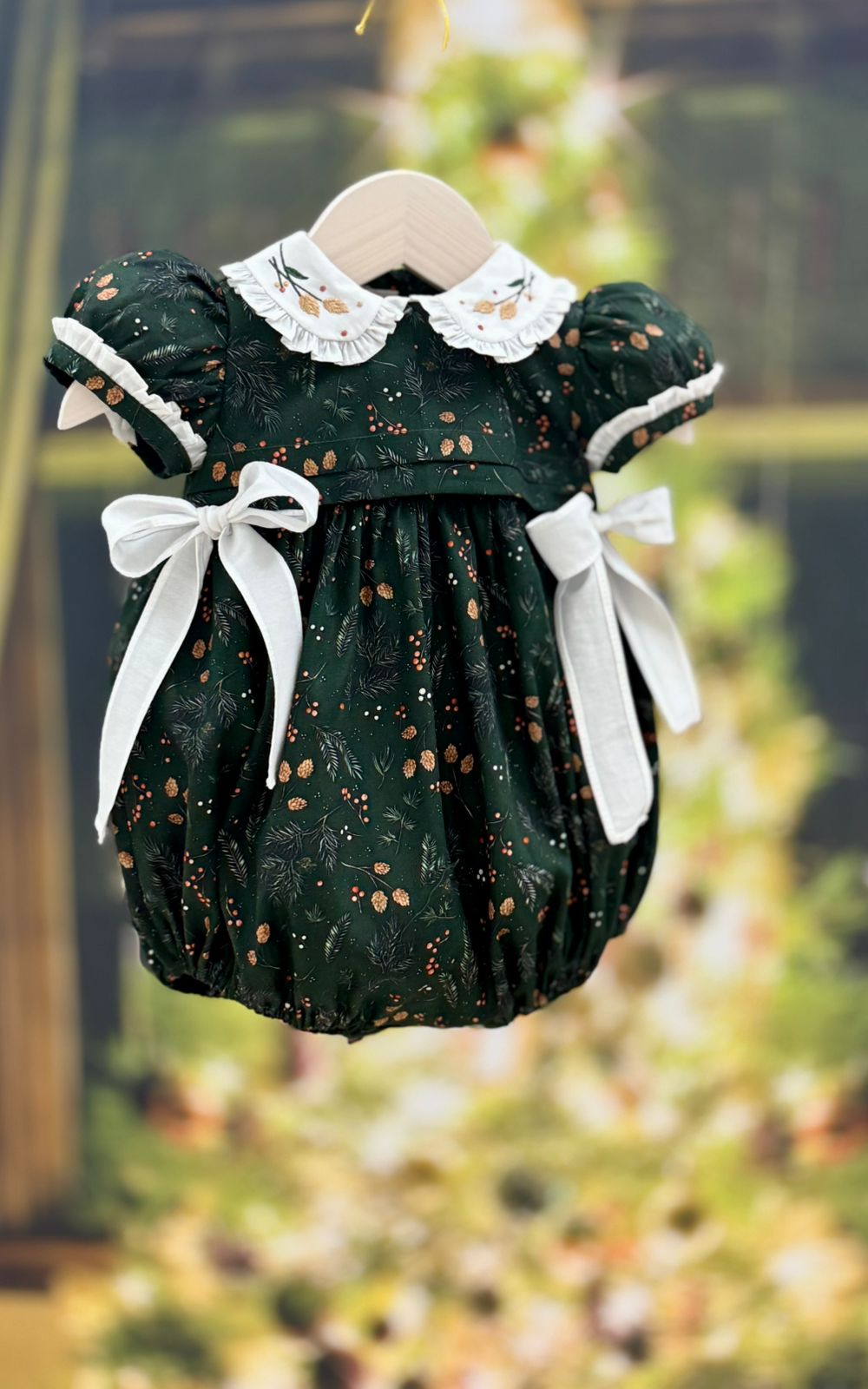 Pimpão feminino em tecido estampado verde, corpo com tomas, golas brancas bordadas e com frufru, mangas com frufru branco, laços laterais brancos. Abertura nas costas e entrepernas.