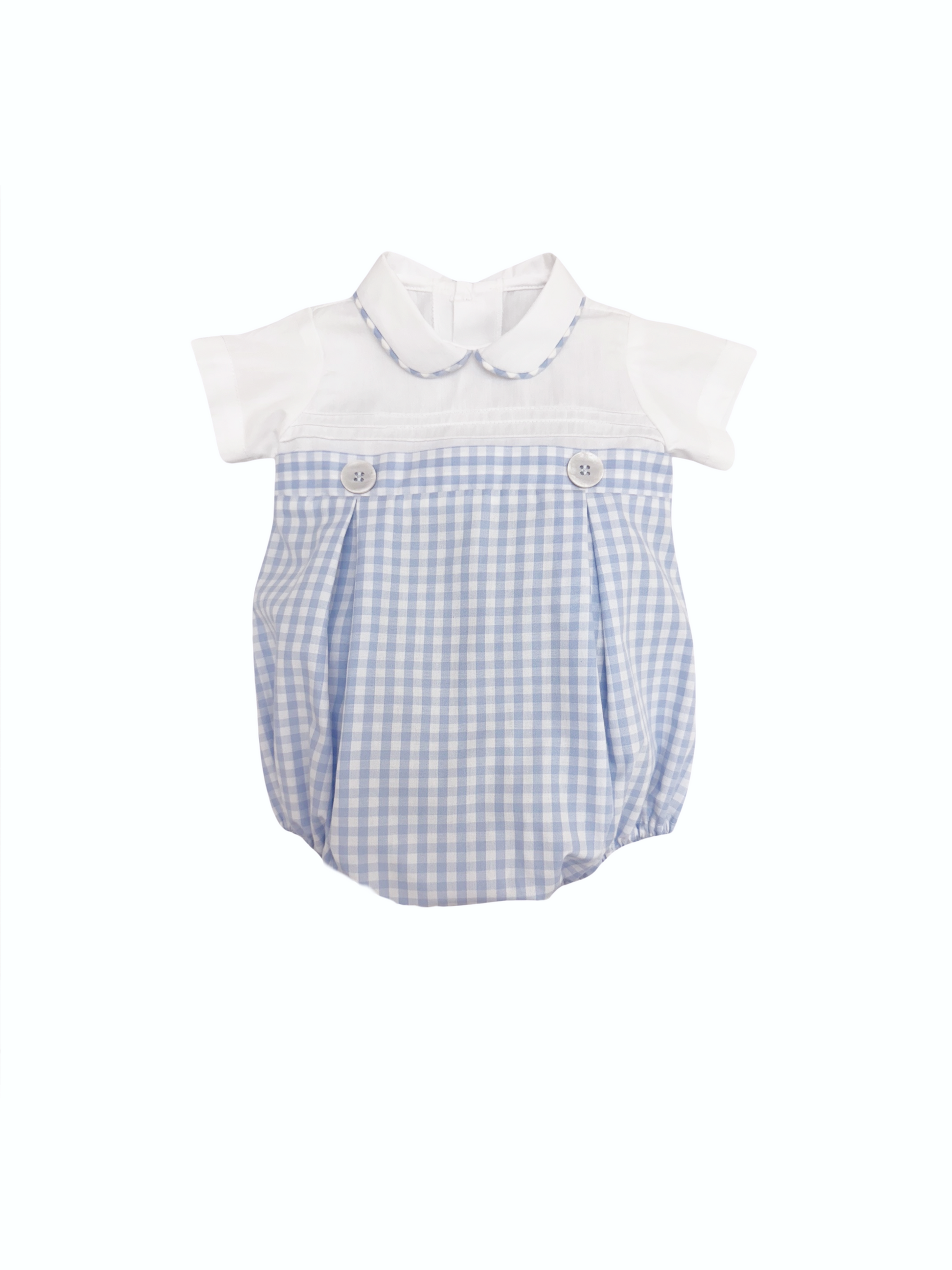 Pimpão masculino, sendo a parte superior em tecido branco, corpo com nervuras, golas brancas com vivo xadrez, corpo em tecido xadrezinho azul, com botões. Abertura nas costas e entrepernas.