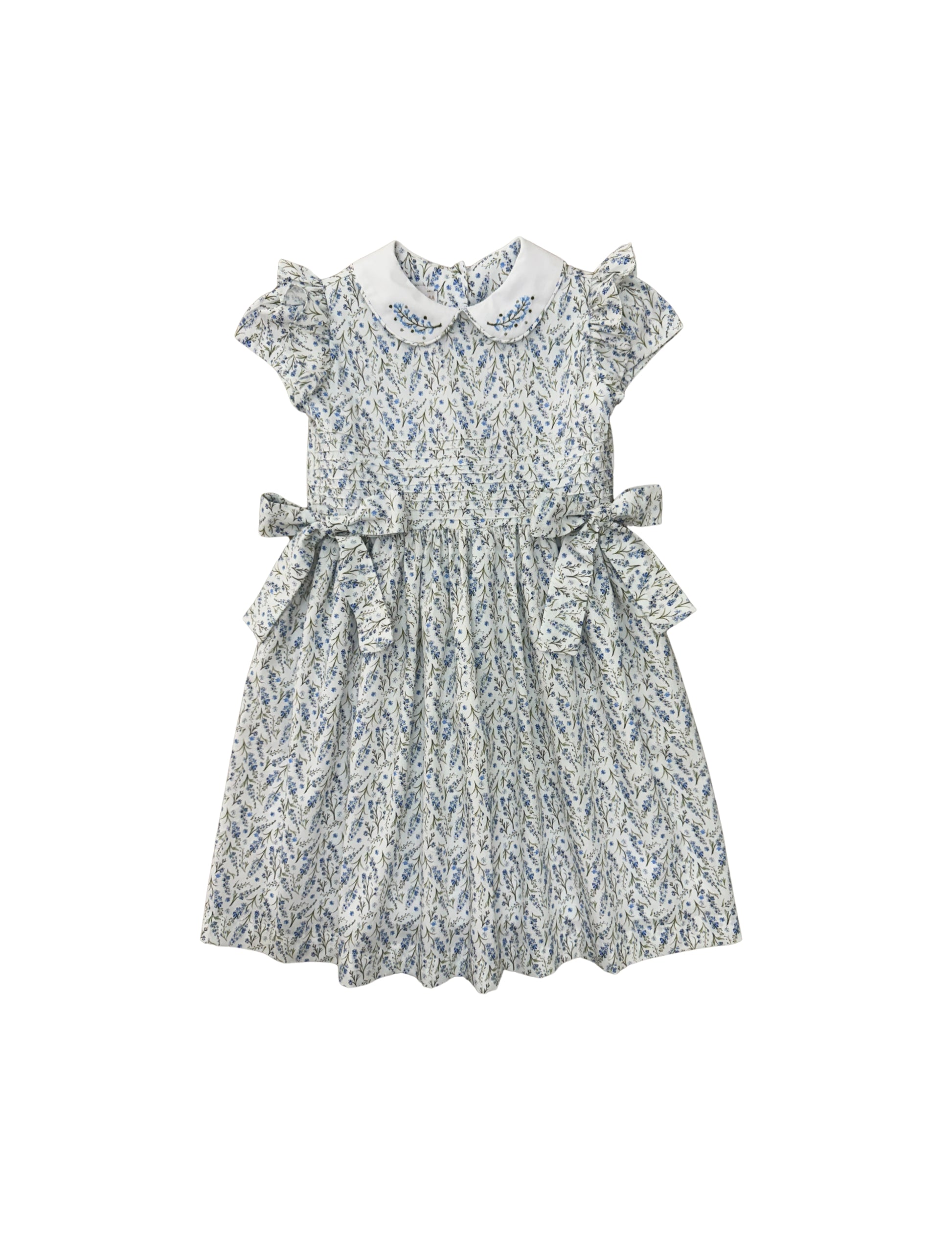 Vestido em tecido floral liberty azul, corpo com nervuras, golas brancas bordadas e com vivo floral, mangas com babado floral, laços laterais florais.