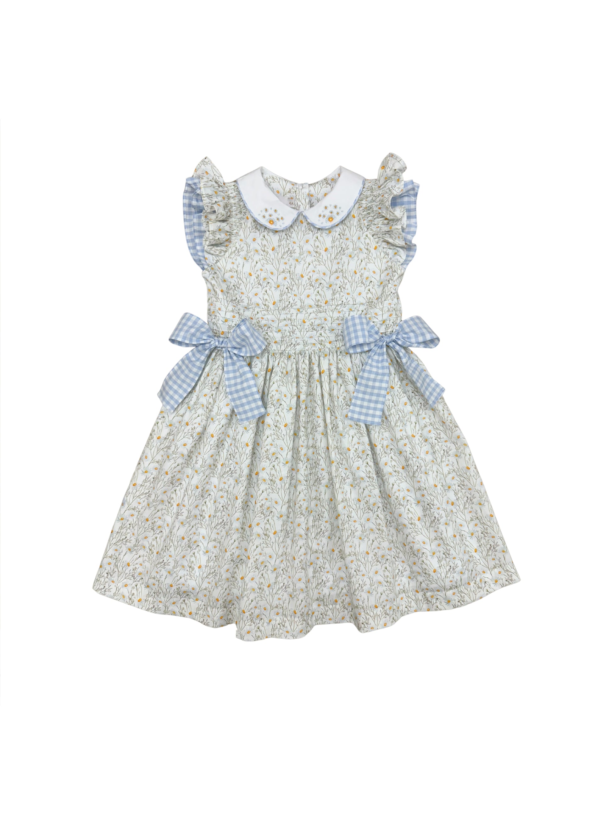 Vestido em tecido estampado margarida em tons de bege, azul e laranja, corpo com nervuras, golas brancas bordadas e com vivo xadrez, mangas lastex babado estampado e xadrezinho azul, laços laterais em tecido xadrezinho azul.